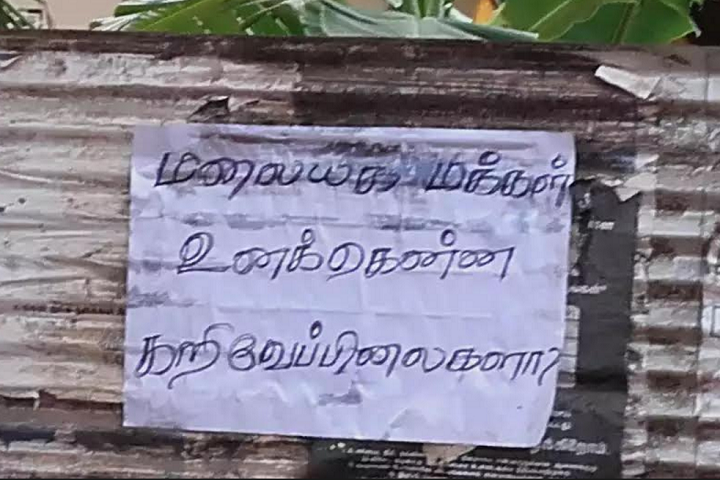மலையக மக்களை பிரதேச ரீதியாக ஒடுக்கும் வகையில் கருத்துக்களை வெளியிட்டதாக குற்றஞ்சாட்டப்பட்ட நாடாளுமன்ற உறுப்பினர் சிறிதரனிற்கு எதிரானவை எனக் கருதப்படும் சுவரொட்டிகள் கிளிநொச்சியின் பல்வேறு பகுதிகளில் ஒட்டப்பட்டுள்ளன.