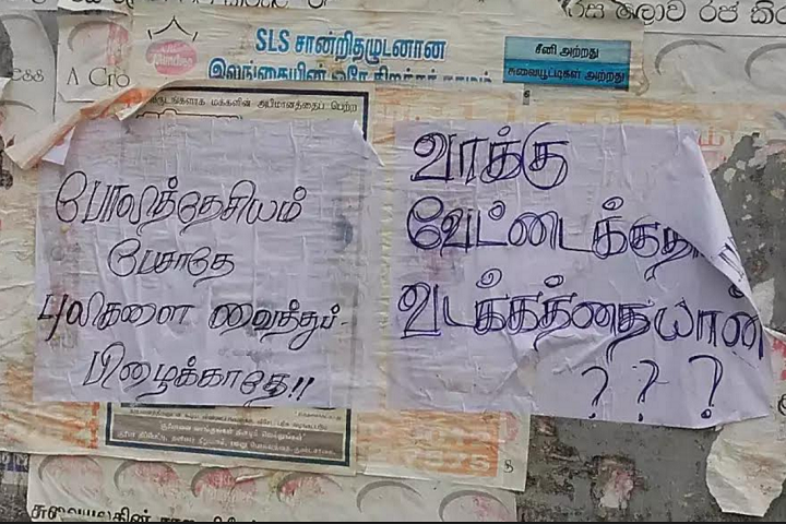 மக்கள் அதிகம் நடமாடும் பகுதிகளான கிளிநொச்சி டிப்போ சந்தி, கரைச்சி பிரதேச செயலகம் உள்ளிட்ட பகுதிகளில் குறித்த சுவரொட்டிகள் ஒட்டப்பட்டுள்ளன.